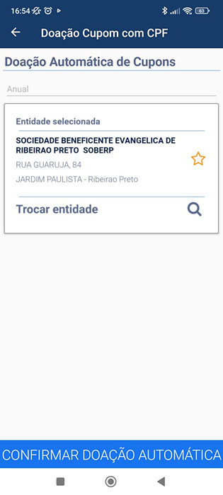Após selecionar a entidade, clique no botão “Confirmar doação automática”. Pronto! Agora os cupons cadastrados no seu CPF serão contabilizados para gerar os créditos para a SOBERP.