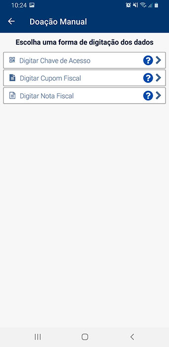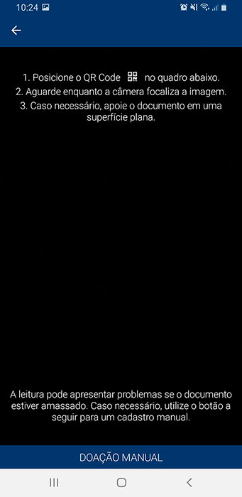 Você pode cadastrar também manualmente um cupom para realizar a doação. Ao selecionar será aberta uma tela para scanear o qrcode do cupom fiscal. Se preferir, você pode preencher os dados manualmente clicando em “Doação Manual”